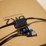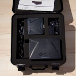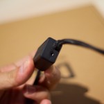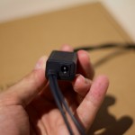 The annoyingly big control box that came attached to the original Rift is gone, and instead there’s a small plastic box at the end of the very long headset cable. Two shorter cables come out from it: HDMI and USB, both connecting to the computer. The box also has a couple of ports: a 2.5mm jack that connects to the camera, and a power plug for the DC adapter. However, the headset is able to run using USB bus power. You will only need external power when plugging the DK2 to an unpowered USB port, or when plugging USB devices directly to the headset.