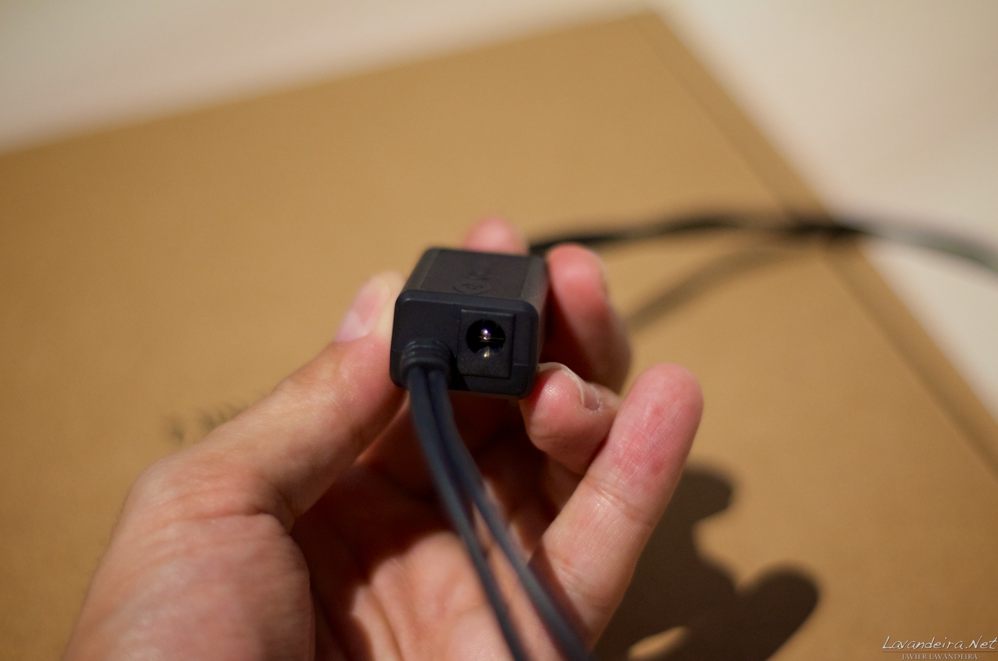 The annoyingly big control box that came attached to the original Rift is gone, and instead there’s a small plastic box at the end of the very long headset cable. Two shorter cables come out from it: HDMI and USB, both connecting to the computer. The box also has a couple of ports: a 2.5mm jack that connects to the camera, and a power plug for the DC adapter. However, the headset is able to run using USB bus power. You will only need external power when plugging the DK2 to an unpowered USB port, or when plugging USB devices directly to the headset.