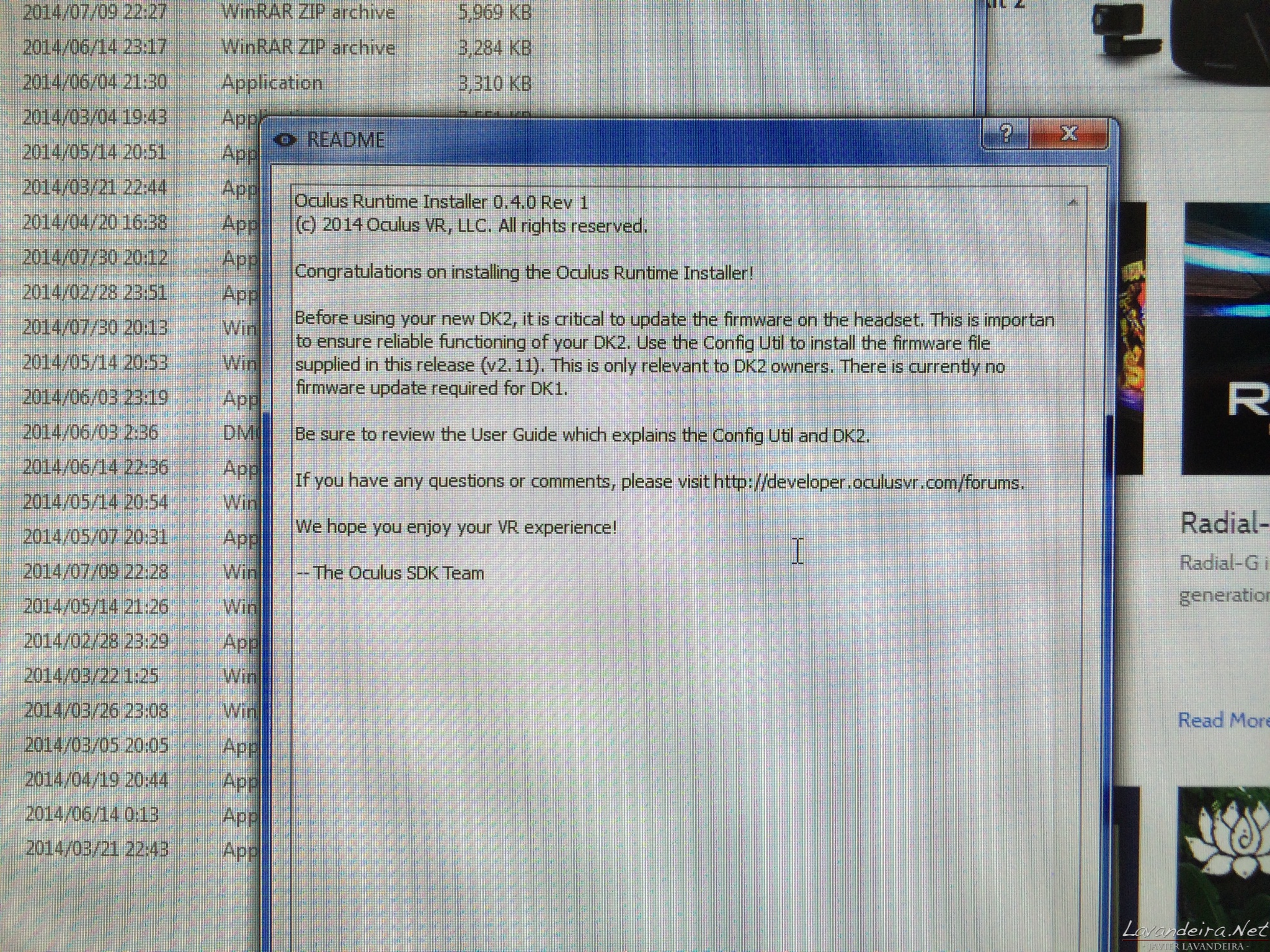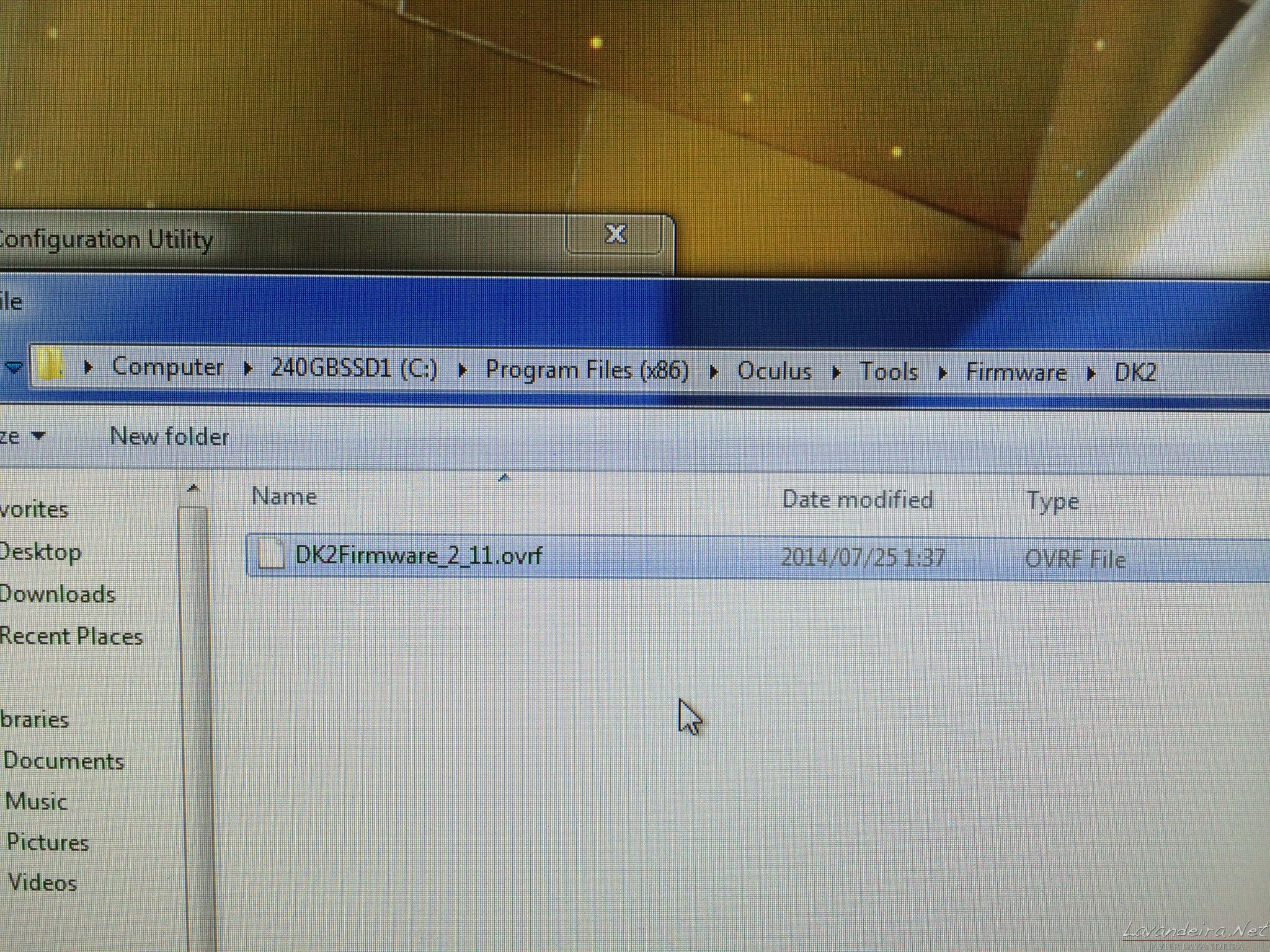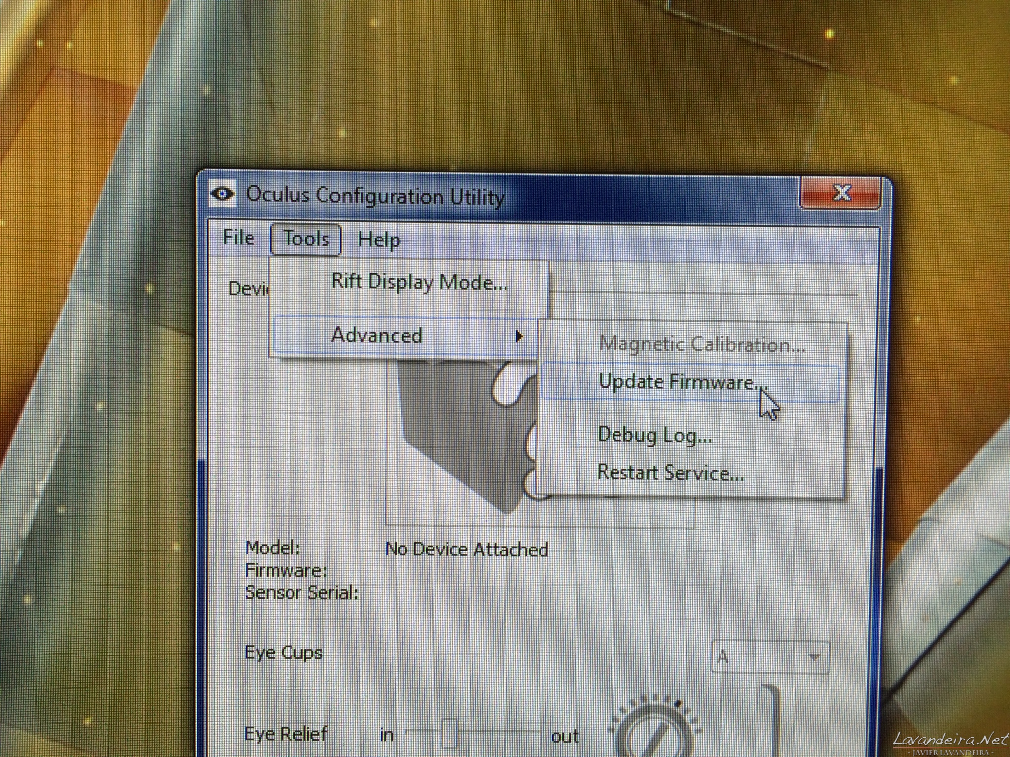 The first thing you’ll have to do after installing the runtime will be updating the headset’s firmware. Mine came with version 2.10, and the v0.4.0 runtime comes with version 2.11. To update the firmware, open the OculusConfigTool (inside the ‘Oculus Runtime’ folder in the Start menu), then click Tools > Advanced > Update Firmware… in the menu. The new firmware is already in your hard drive, under Program Files (x86) > Oculus > Tools > Firmware > DK2.