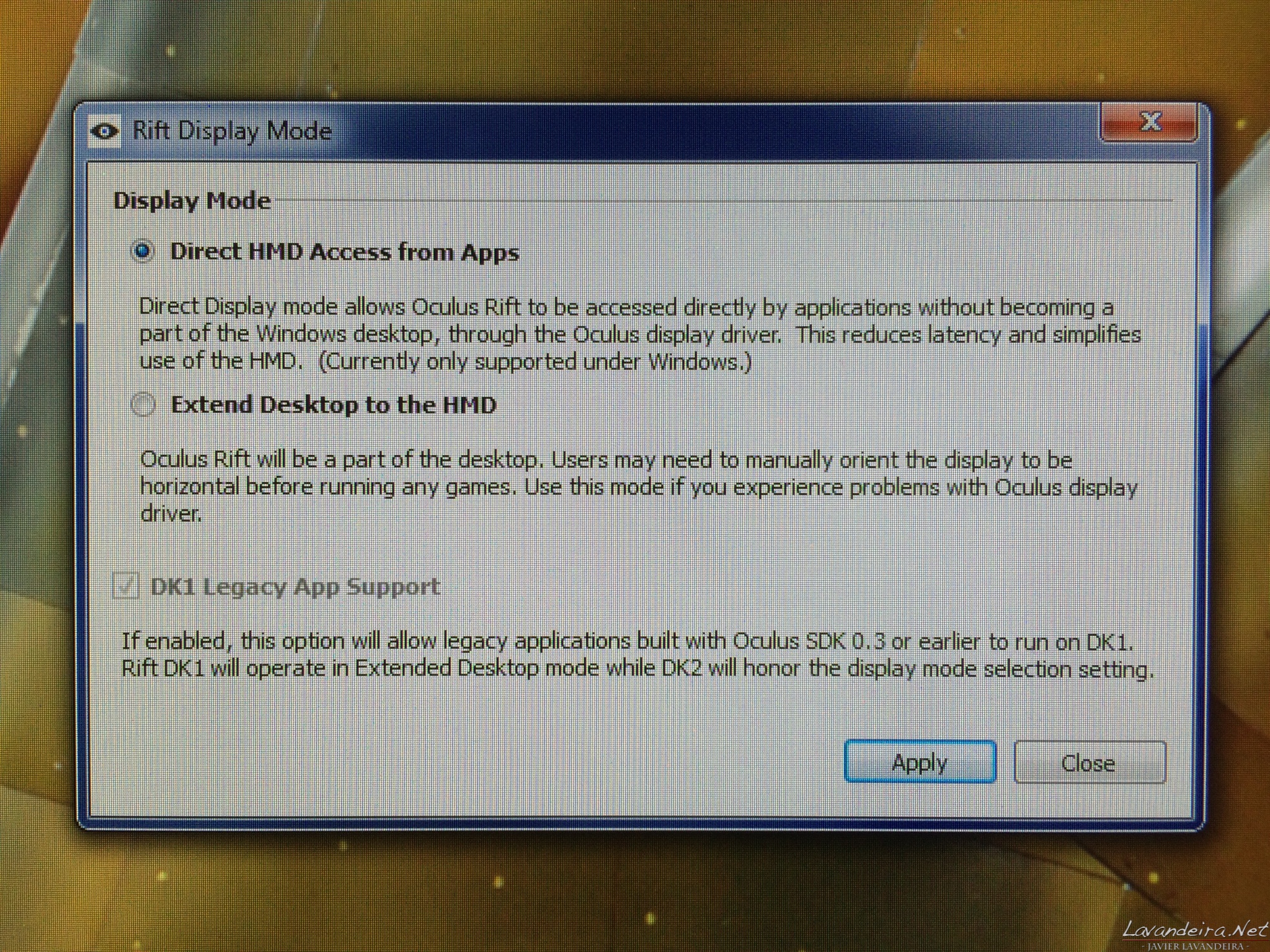 About the display modes: unlike the DK1, the DK2 doesn’t work as secondary display. Instead, applications access it directly using the Oculus display driver. The Rift’s screen remains off when applications aren’t using it. This mode is only supported under Windows. The Rift DK2 can operate as an extended display as well, if for any reason an application can’t use the Oculus driver. In this case, the computer will see the DK2 screen as a 1080×1920 screen in portrait mode, which is very annoying if you’re duplicating displays.
