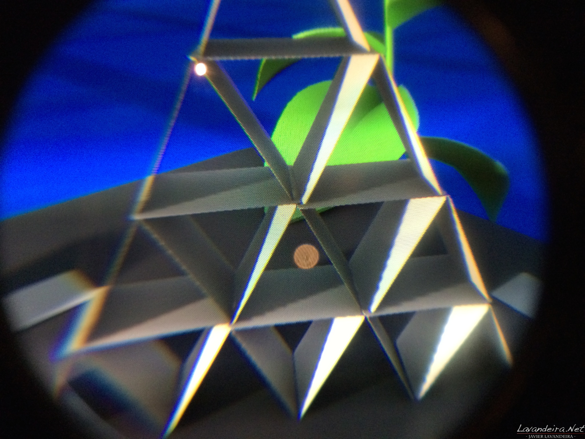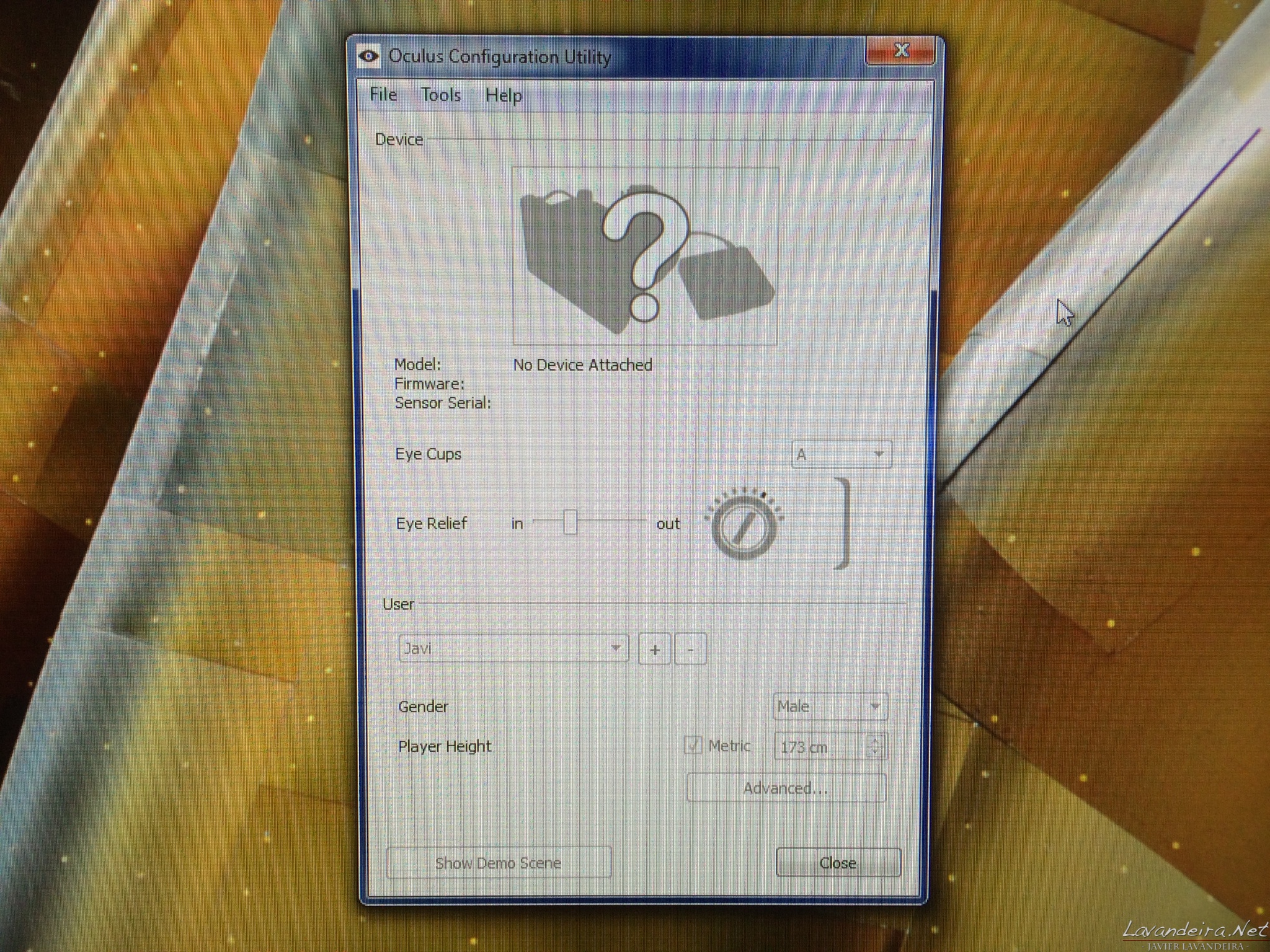 The OculusConfigTool includes a very simple demo scene consisting on a desk with several items on top of it: a potted plant, a lamp, some sheets of paper and pencil, a beverage can, and a pyramid made of stacked cards with some more cards lying around it. The DK2 allows you to move closer and closer to the stack of cards and see the small details. It is also possible to get closer to the lamp, move under it, turn your head up and look at the bulb inside. This adds an incredible degree of realism… until you turn your head away from the camera. The camera is unable to track your position when you turn all the way because there aren’t any infrared LEDs there.