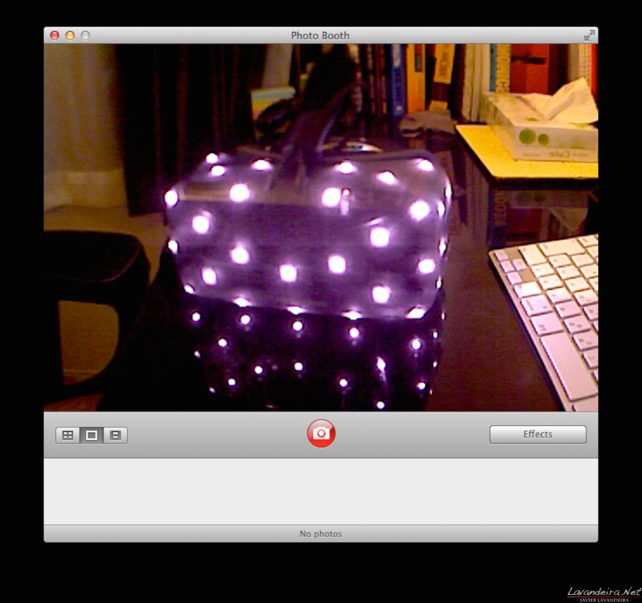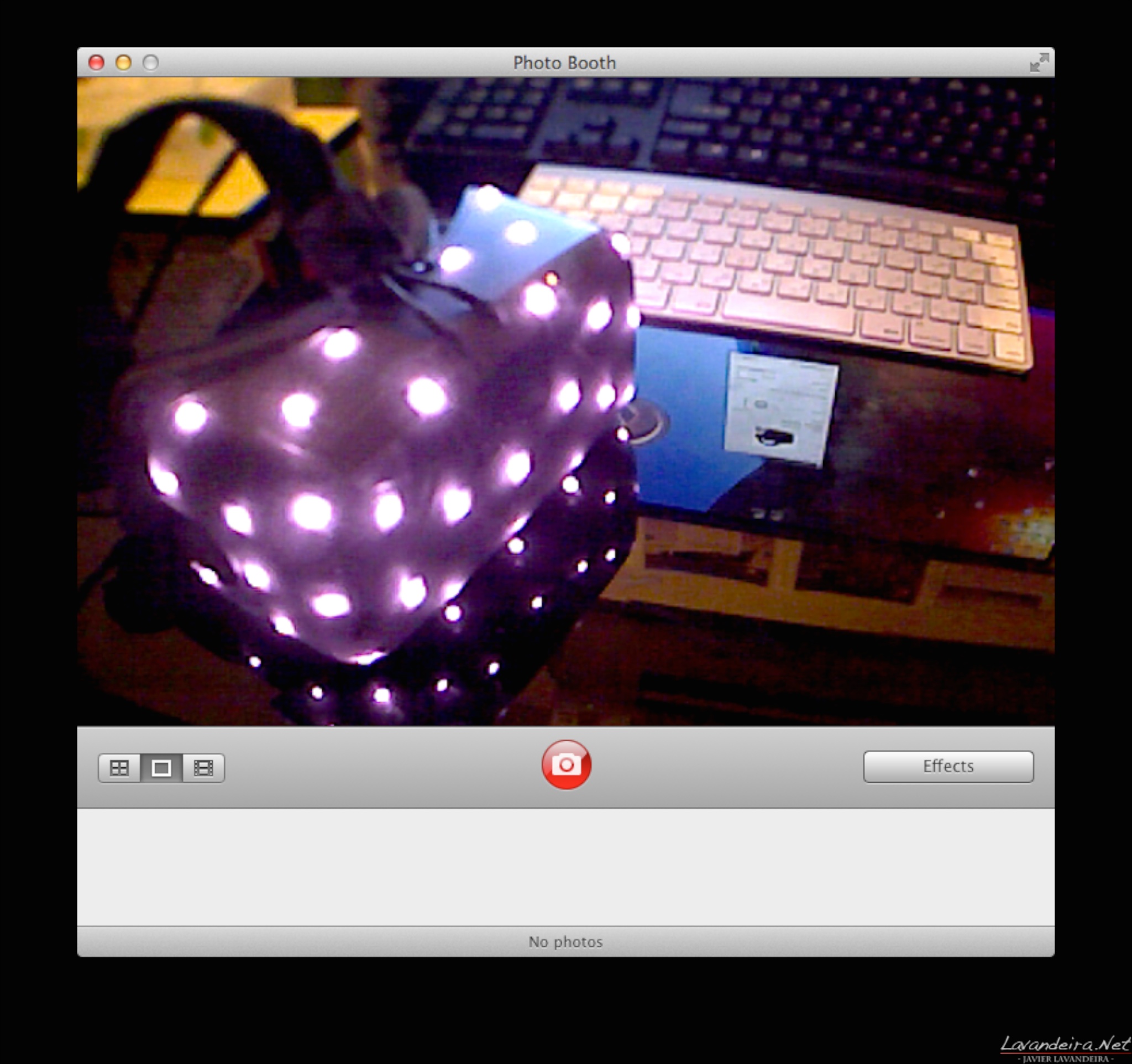 The DK2 fixes this in a very effective way. You put the infrared camera in a location where it can see you move around. The headset tracks your orientation, and the camera tracks your position via a bunch of infrared LEDs in the headset. These infrared LEDs aren’t visible to the naked eye becaise they’re under the headset’s black plastic cover. However, this plastic is not completely opaque. It allows infrared light to pass. This is what the DK2 looks like when looking at it through an infrared camera: