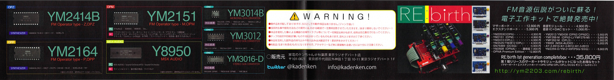 Mr. Nakagawa was very kind to give me an issue of a Japanese magazine about electronics (Denshi Kosaku Magazine, 電子工作マガジン). The Autumn 2014 issue features RE:birth in a 4-page article (pages 92-95), and it even mentions it in the cover. The article only mentions a few of the modules that were available when it was written.