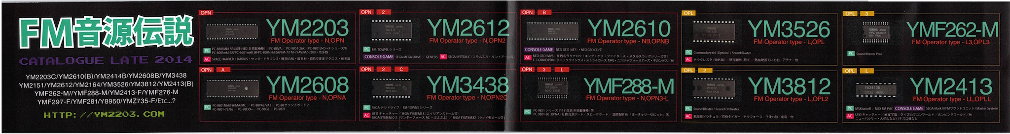 - YM2413 (MSX 2+/turbo R, Sega Mark III FM Sound Unit, Sega Master System, UFO catchers and arcades)