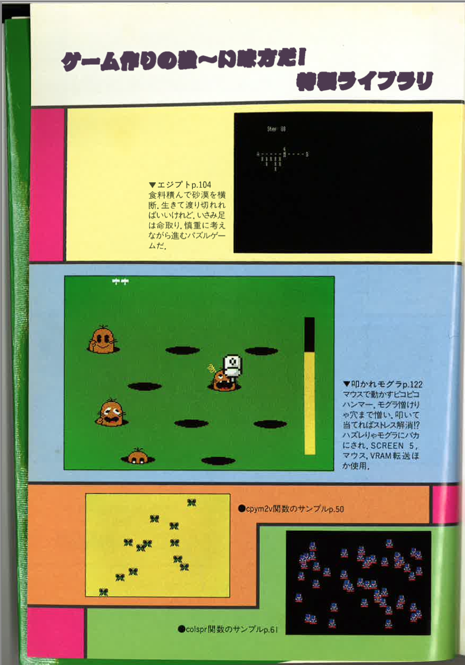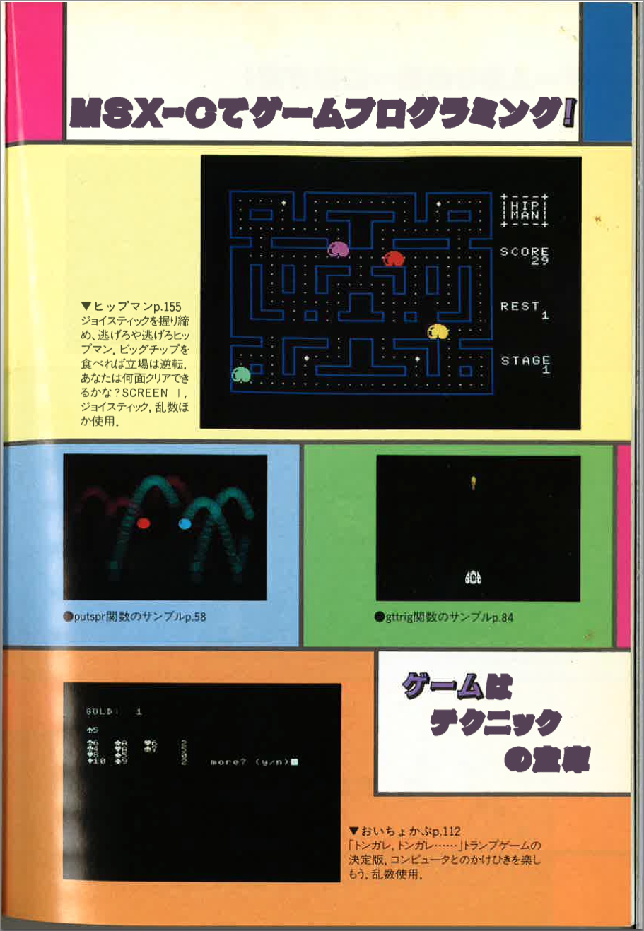 This second book (green cover) applies the matter explained in the first book to the development of games for MSX2 computers. The authors develop a simple C library to handle several aspects of the MSX hardware, and provide several simple example games.