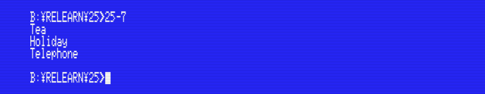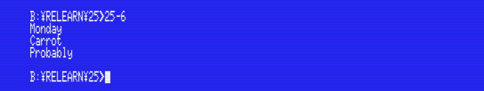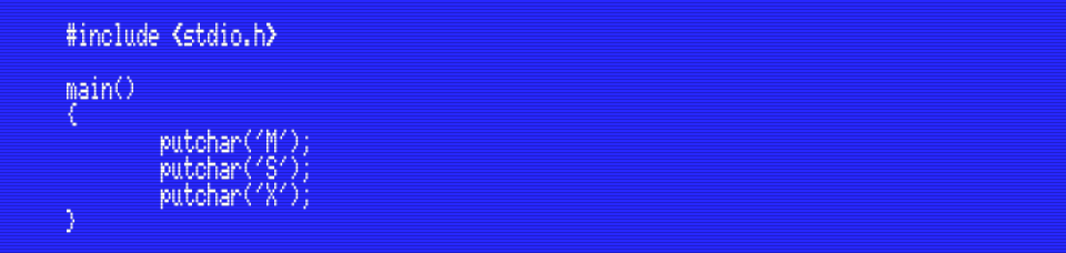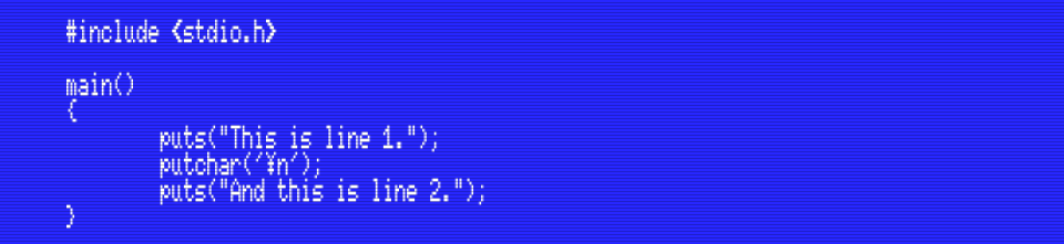 It’s not obvious in this screenshot, but unlike the BASIC statement PRINT,  putchar() doesn’t output a new line character after the character. This example will make it clear: