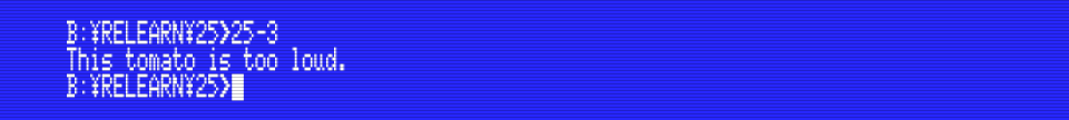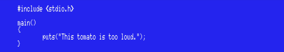 Let’s see a simple example: a program that prints the string constant “This tomato is too loud.” on the screen: