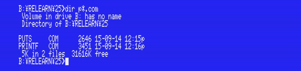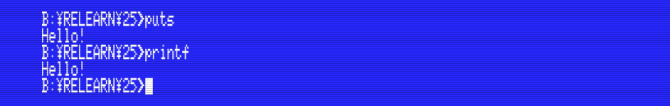 Both programs do the same, but PUTS.COM is 2.5KB and PRINTF.COM is 3.3KB. The difference between these is the difference in size between puts() and printf(). puts() is also much faster because it doesn’t have to do any processing. In other words: