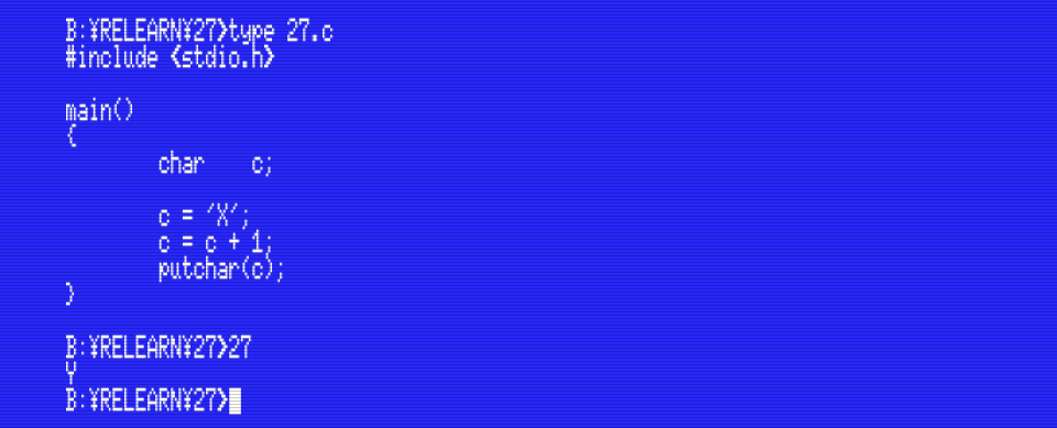 This program declares a variable called c of type char and assigns the value ‘X’ to it. What actually happens at this point is that the MSX-C compiler replaces ‘X’ by the ASCII code of this character (the number 88). Then the program increments c so it is now 89, which happens to be the ASCII code of the character ‘Y’, and that’s exactly what putchar() prints on the screen. This wouldn’t work in BASIC: