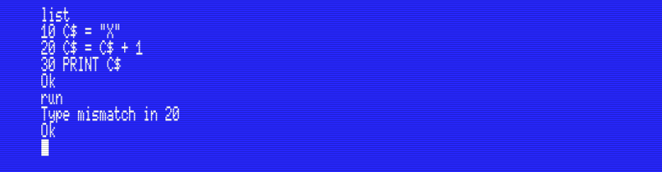 In MSX-BASIC we would be getting an error if we tried to add a number to a string variable. Remember that C doesn’t care because internally every char is just a number.