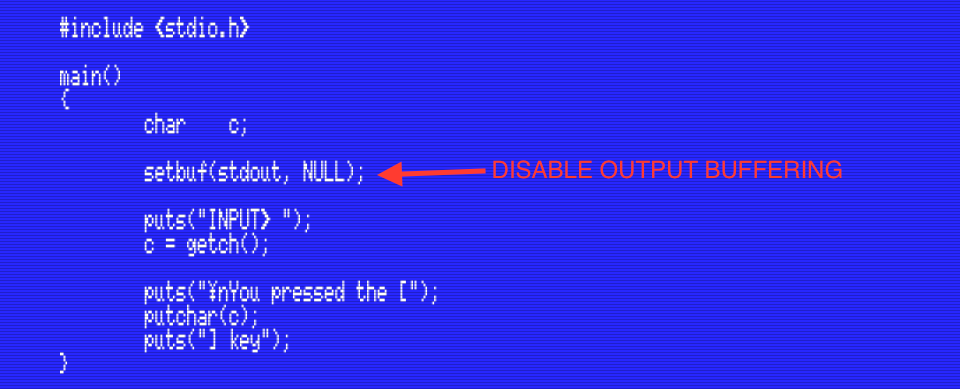 The first way uses the setbuf() library function. We will see it with more detail in a future post, but for now remember that we can disable buffering by calling it like this at the beginning of our program:
