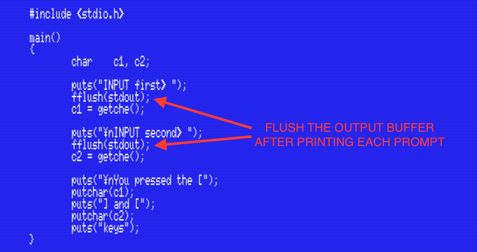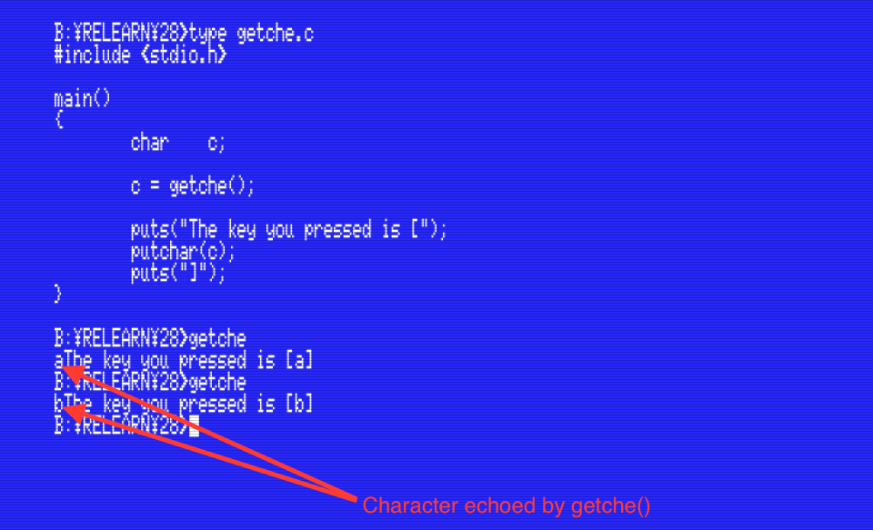 - The MSX-C Ver.1.1 version of getch()/getche() always check the keyboard, regardless of whether the input is redirected or not. Because of this we can’t chain the input of an MSX-C Ver.1.1 program to read commands from a file.
