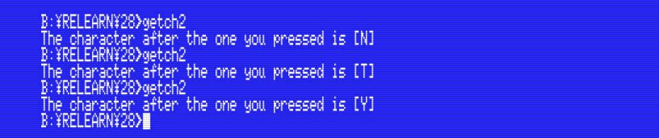 This program does the same thing as the previous one, but it adds 1 to the character code returned by getch(), so it prints the next character. For example, if we run GETCH2.COM three times and enter the letters M, S and X we get this result: