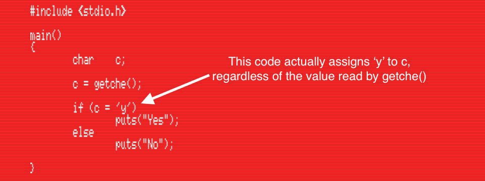 The program above is intended to get a character from the keyboard and print “Yes” on the screen only if the character was ‘y’. However, what actually happens is that it always prints “Yes” no matter what key we press. The reason is that the expression inside the parentheses after the if isn’t comparing anything, but it’s assigning ‘y’ to the variable c. The expression has to be rewritten to use == instead of =: