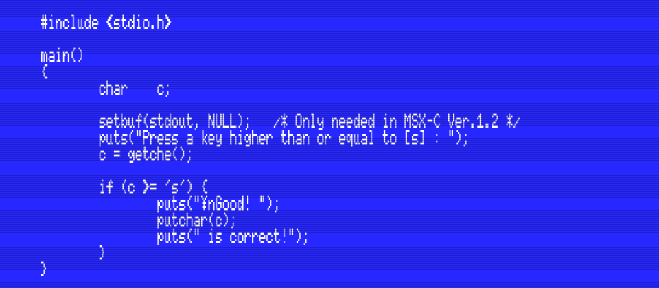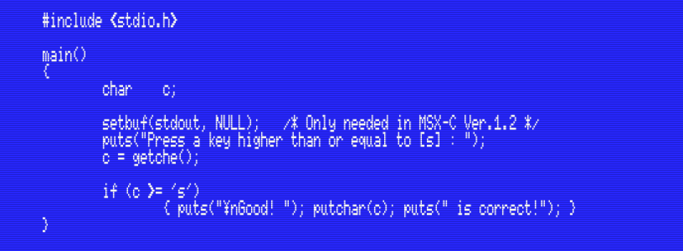 The meaning of this piece of code is: “if condition is true, then execute statement“. This is very similar to the IF statement in MSX-BASIC, but note that in C the keyword THEN doesn’t appear. Also, the condition must always be written inside parentheses.
