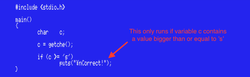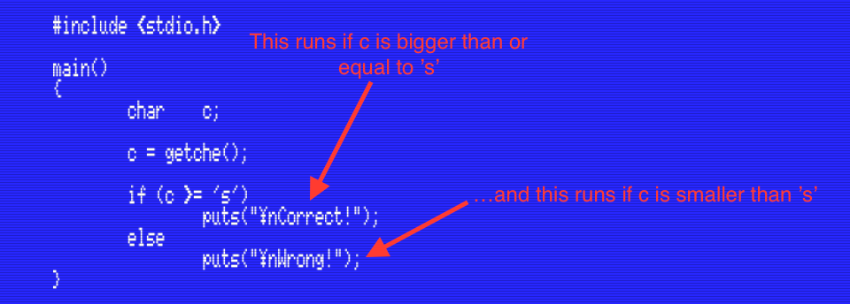 The following example program reads a key press from the keyboard, and prints a text message if the character pressed is higher or equal to ‘s’: