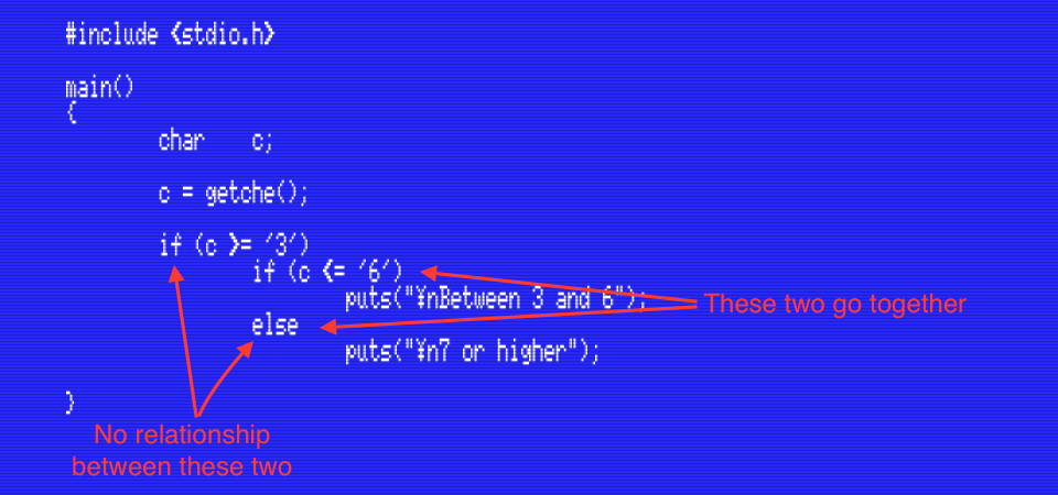 As you can see in the program above, the statement following the if doesn’t have to be in the same line (as was the case in MSX-BASIC). In fact, most of the time we will place the statement in the following line and indented a few spaces to make it clear that the code depends on the if . There are many indent styles, and which one you use is up to you. I’m using the K&R style with 8-space indents.