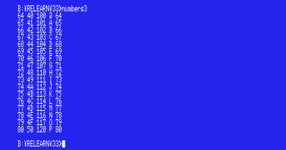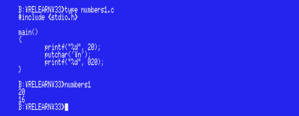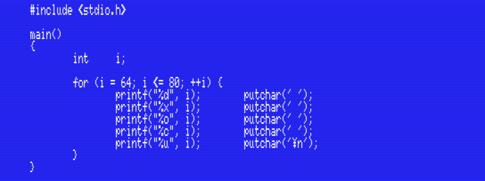 Compile and run it and you’ll see that it prints numbers 64 to 80 (inclusive) in all five notations side by side: decimal, hexadecimal, octal, character and unsigned decimal (which in this case happens to be the same as signed decimal):
