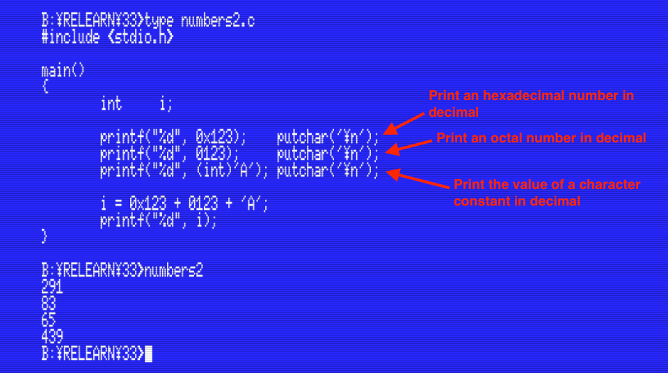 As an example, the program below uses all four notations: decimal (in the output), hexadecimal, octal and a character constant. Note how besides printing the values, we can also perform arithmetic operations (in this case a sum) regardless of the notation used.