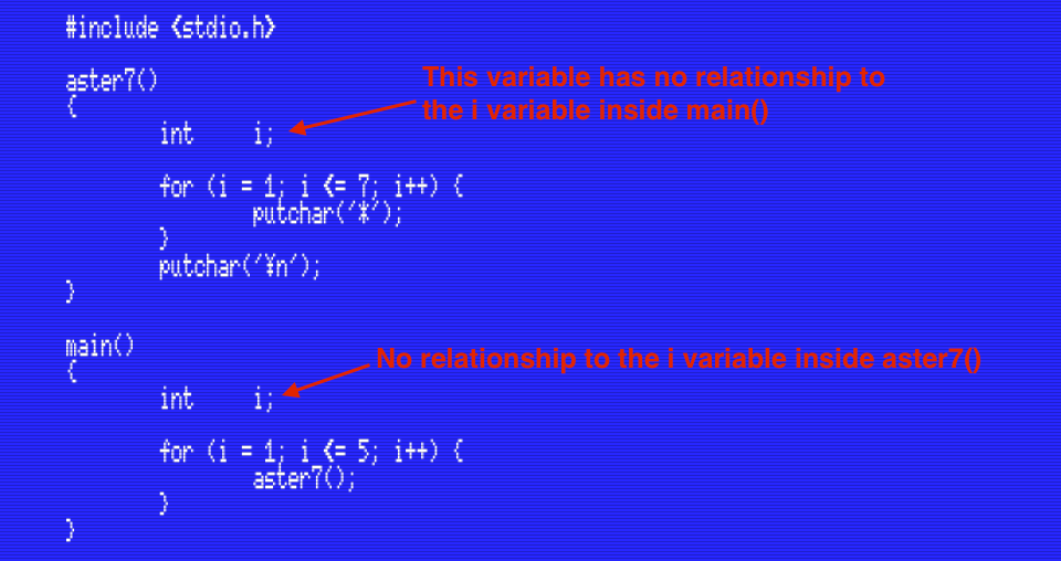 This is because both i variables are local and isolated from the i variable in any other function. Changing the i variable inside aster7() doesn’t affect the i variable inside main(), and vice versa.