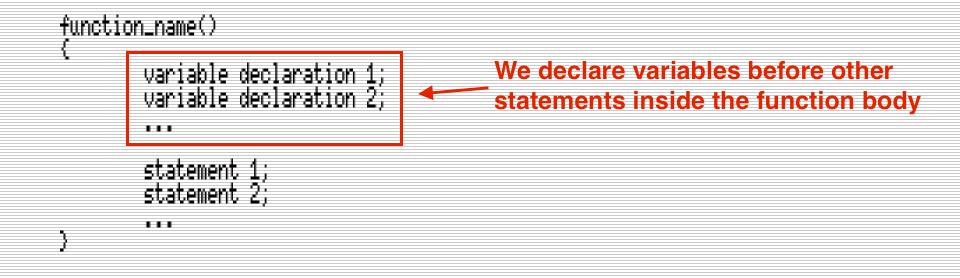 In C, each function can have its own local variables. We declare these at the beginning of the function body, before any statements. We’ve already seen how to declare variables inside main(); it works in exactly the same way for any other function: