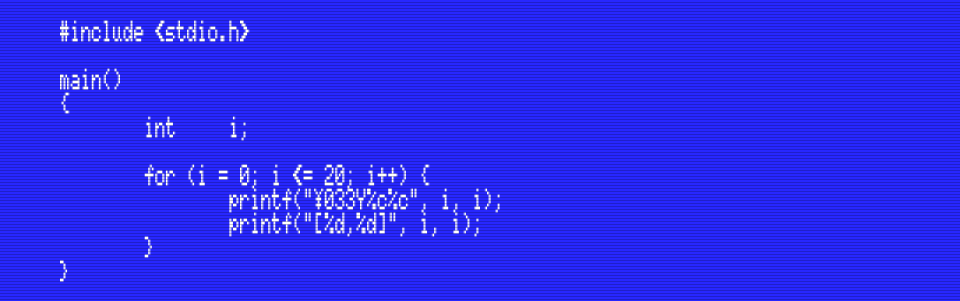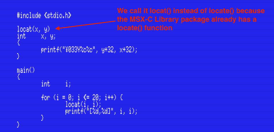 The C language doesn’t have a LOCATE statement to position the cursor like MSX-BASIC does, but we can easily make our own function that takes the screen coordinates and puts the appropriate escape sequence on the screen: