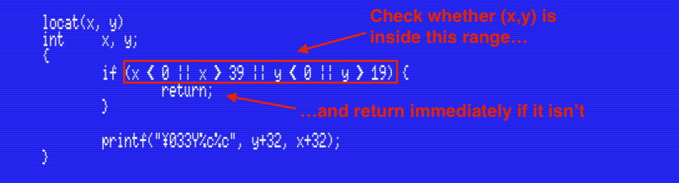 For example, let’s modify the locat() function in the program above so that it will check that the coordinates are in the range (0,0)-(39,19) and return without doing anything if they aren’t: