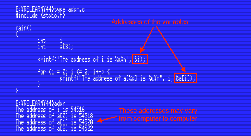 All variables, arrays, and code in our program is stored in these memory cells. In BASIC we didn’t usually need to know where the program stored variables in memory (though there was anyway a VARPTR function that returns the address of a variable). In C we will use these addresses quite often.