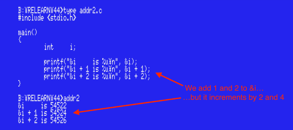 In this example, when we add 1 to &i the address increases by 2. When we add 2 to &i the address it increases by 4. There’s a reason for this, and it has to do with the type of the i variable.