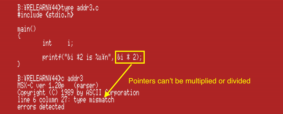 Values of type pointer always contain memory addresses. One way in which they behave differently from other values is that they can’t be multiplied or divided. Trying to do so will result in an error during compilation: